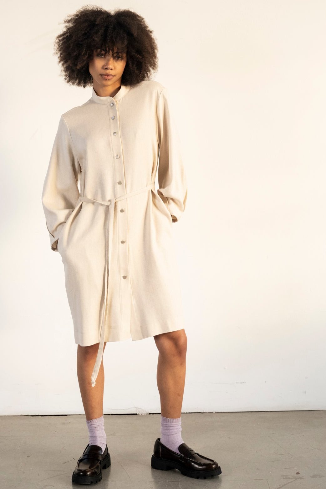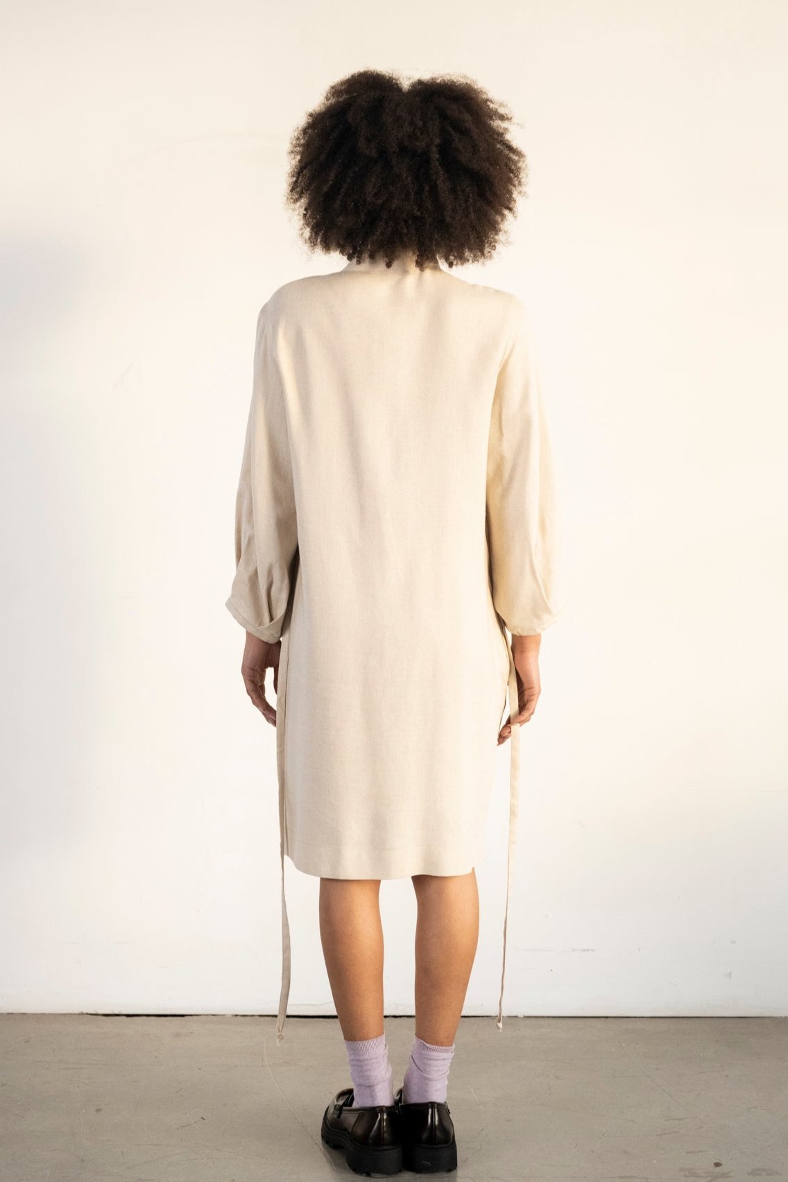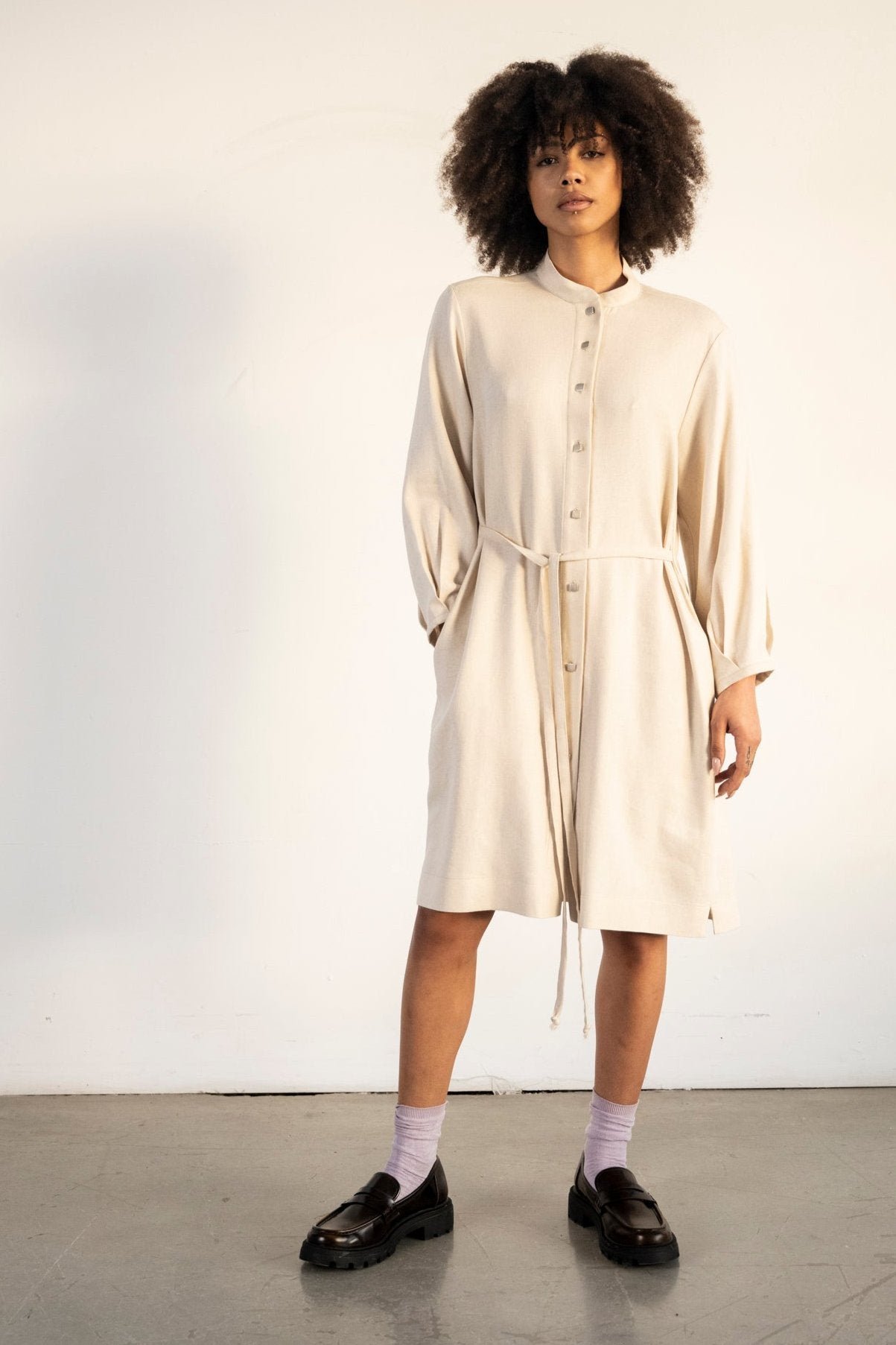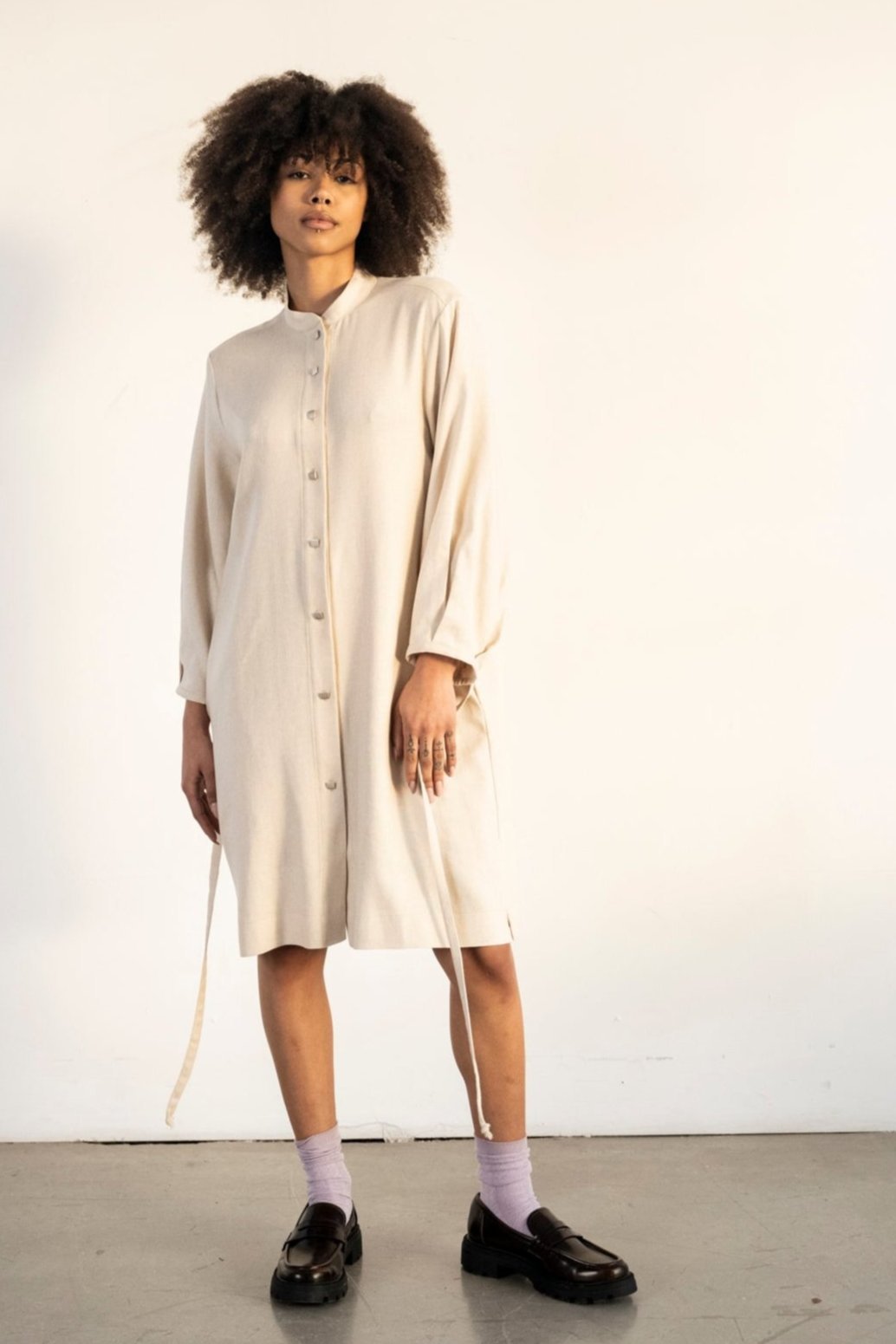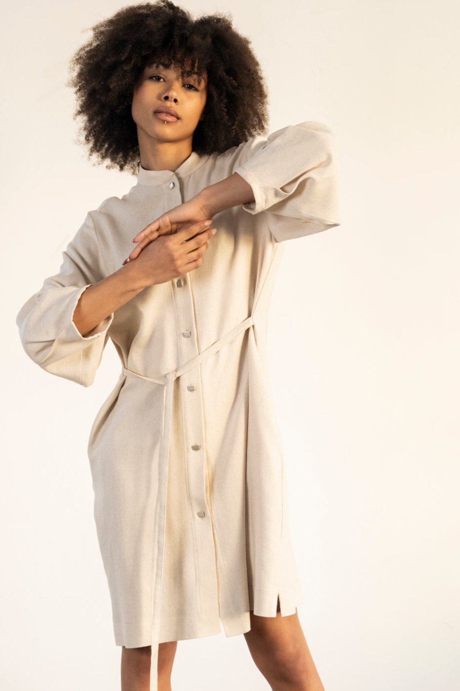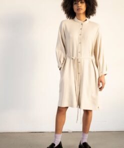 Button down shirt dress with mandarin collar. Long sleeves with pleat details that gives volume. Strings detail at the waist that can just hang loose or can be tied up front or back to give waist effect.