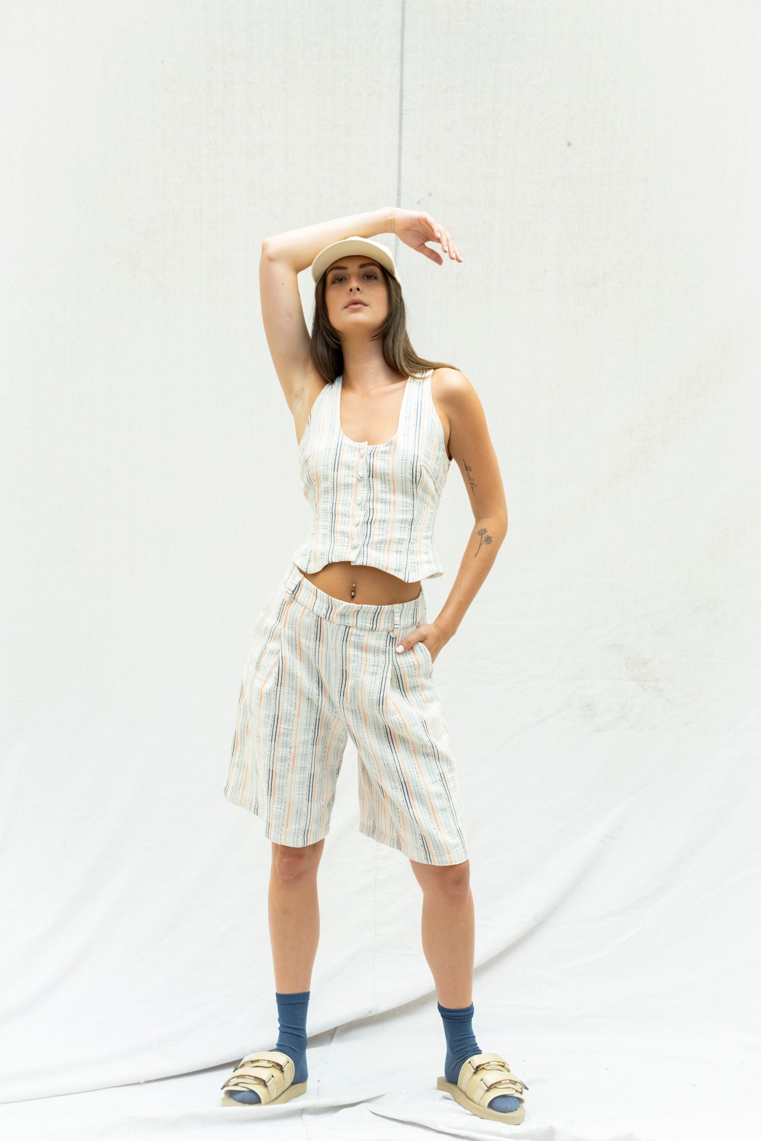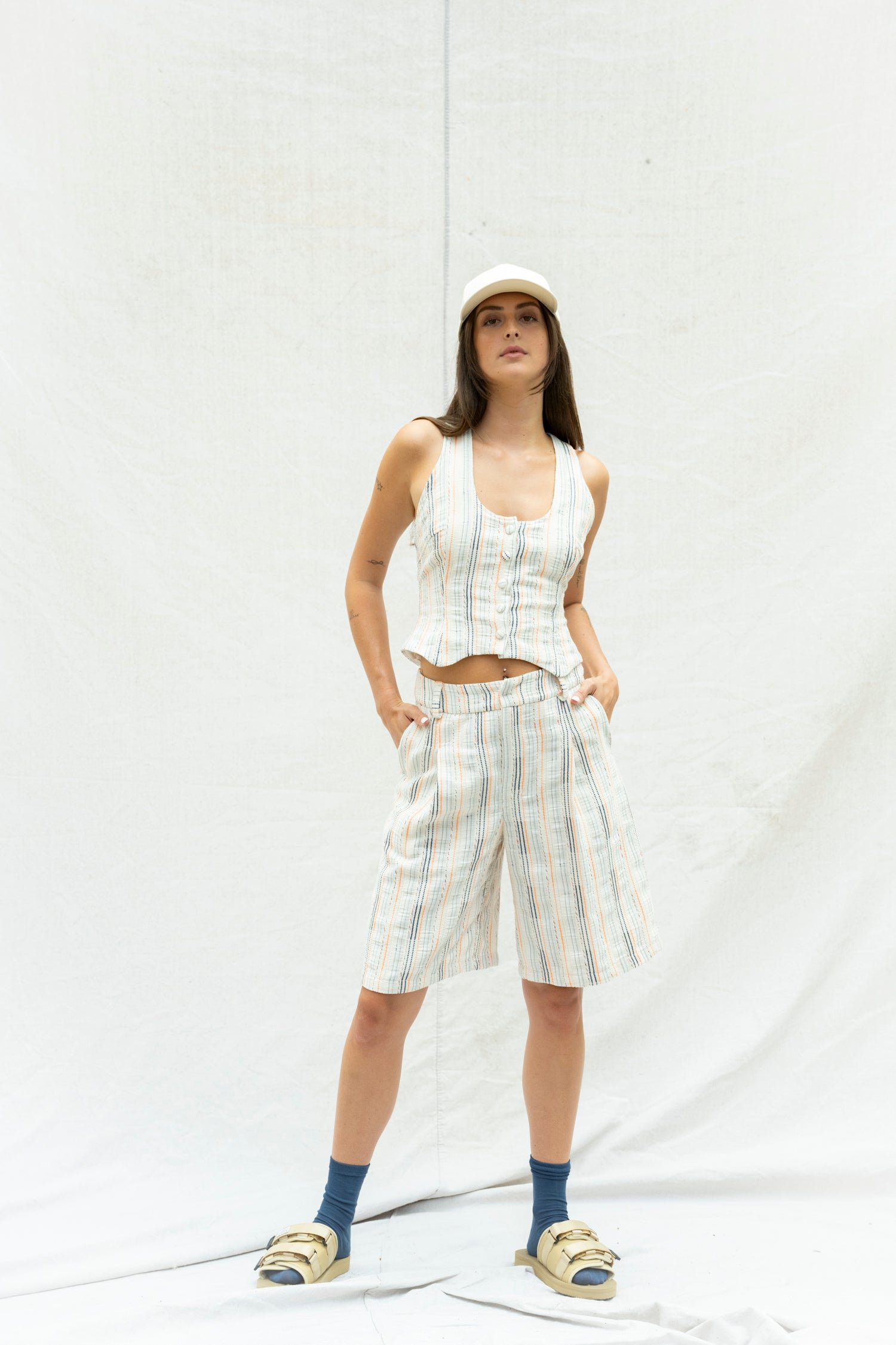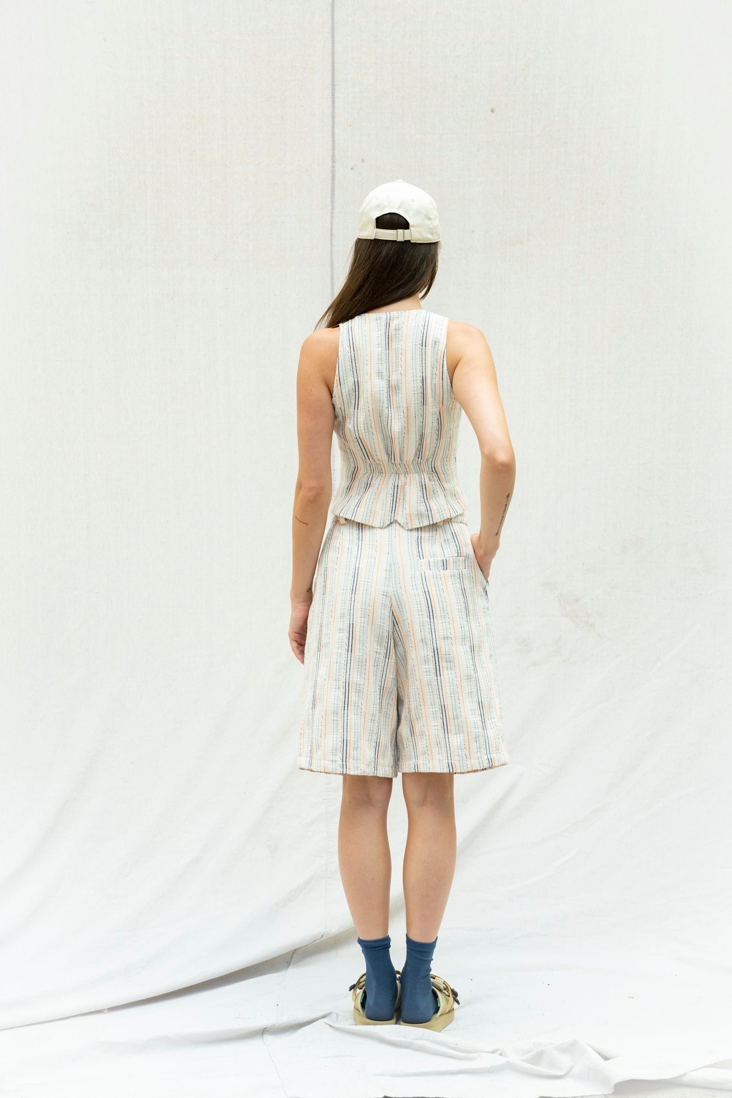 A striking combination of blue and orange stripes, along with metallic, blue and pink accents on a delicate cream background. This adds texture to the design, and its loose construction allows for breathability.