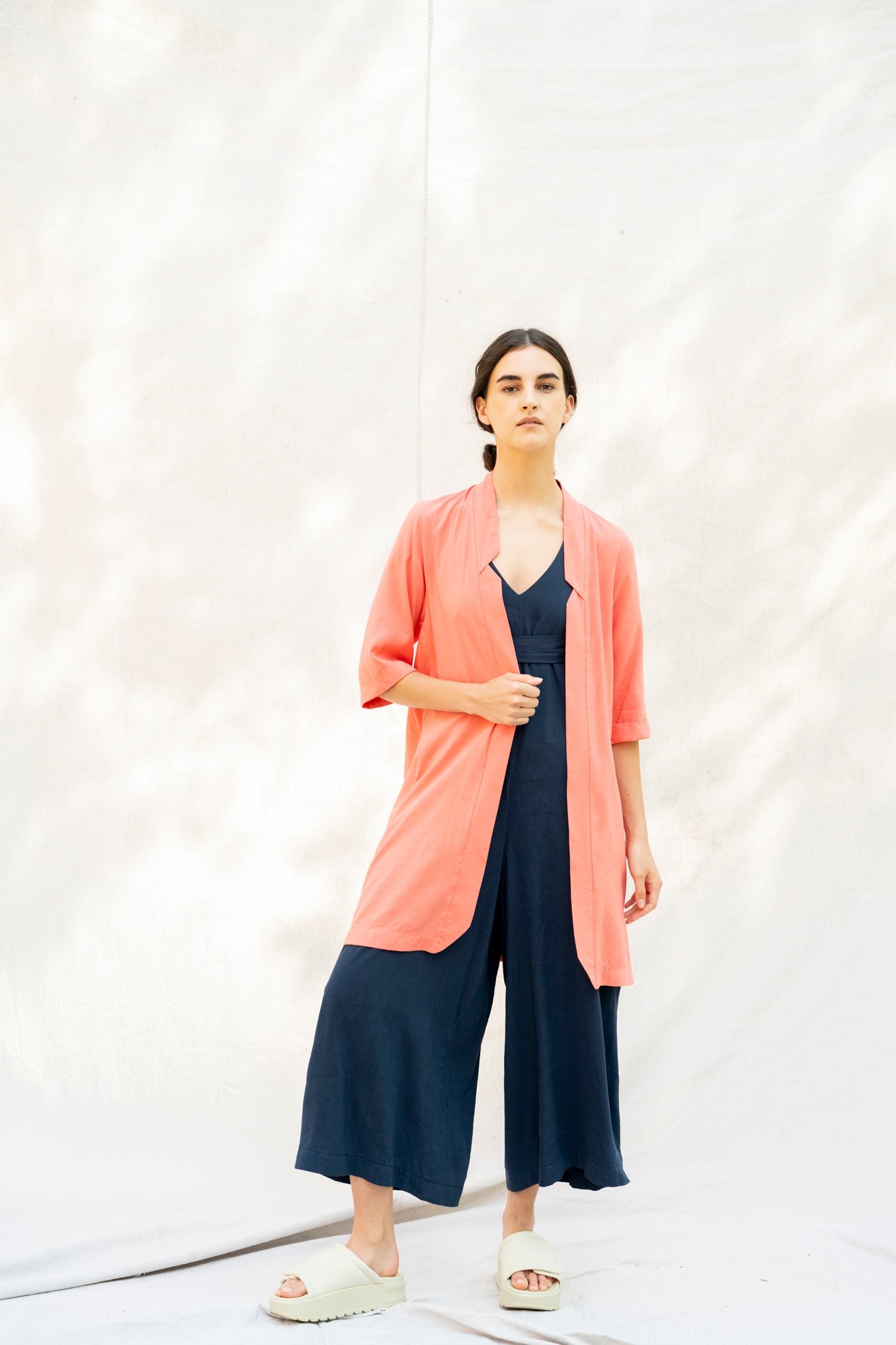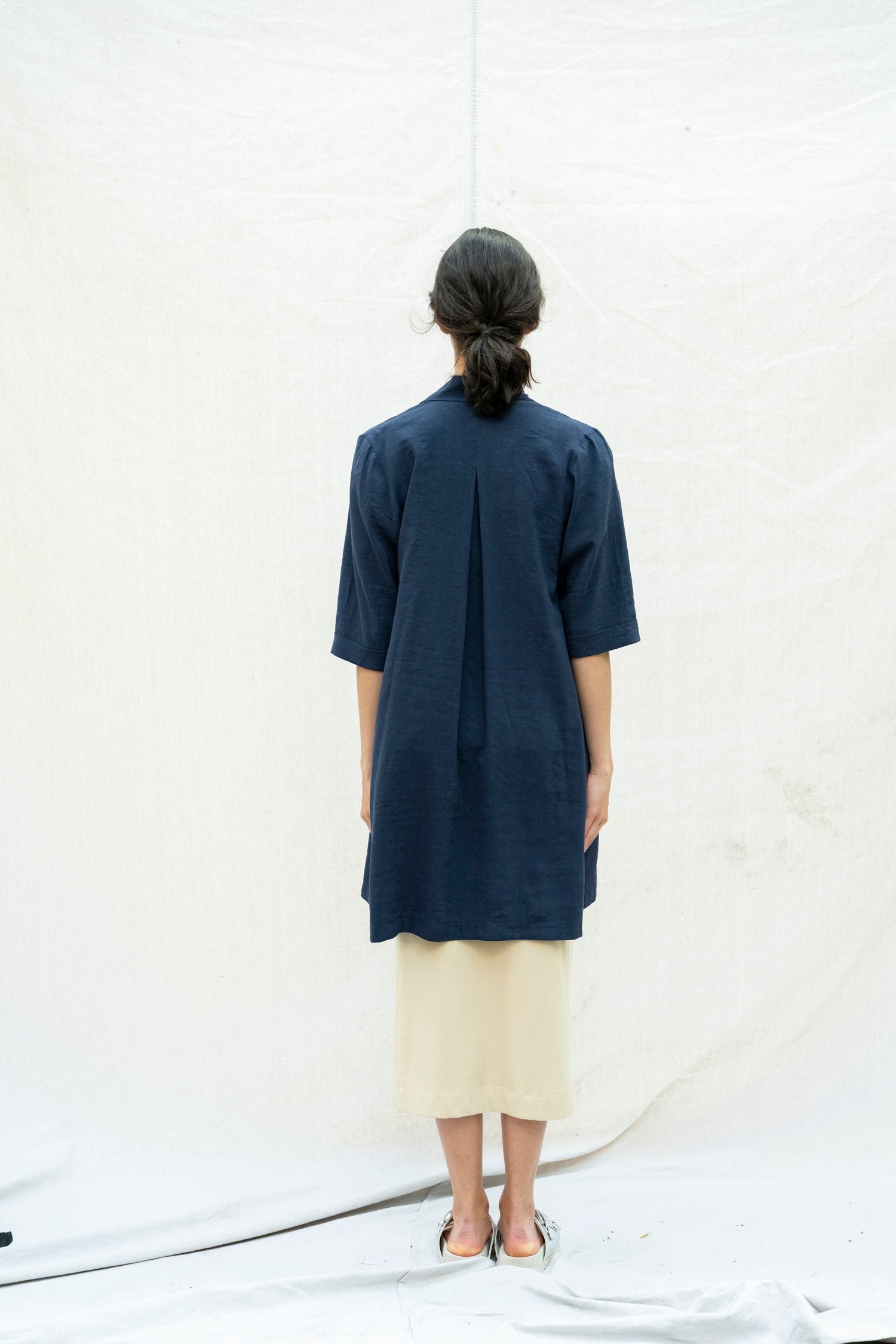 This jacket features a dual notched collar, no closure, a back pleat, elbow-length sleeves, and an angled finish at the bottom front hem.