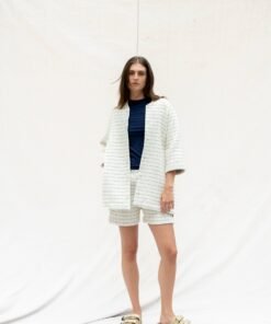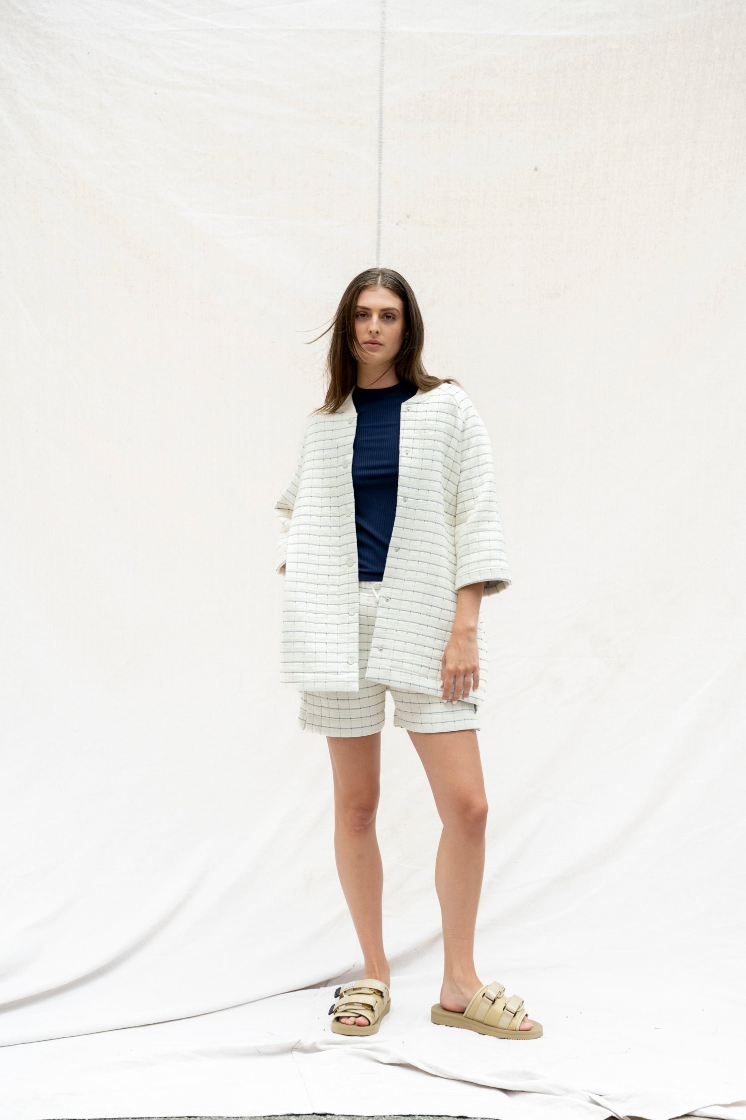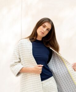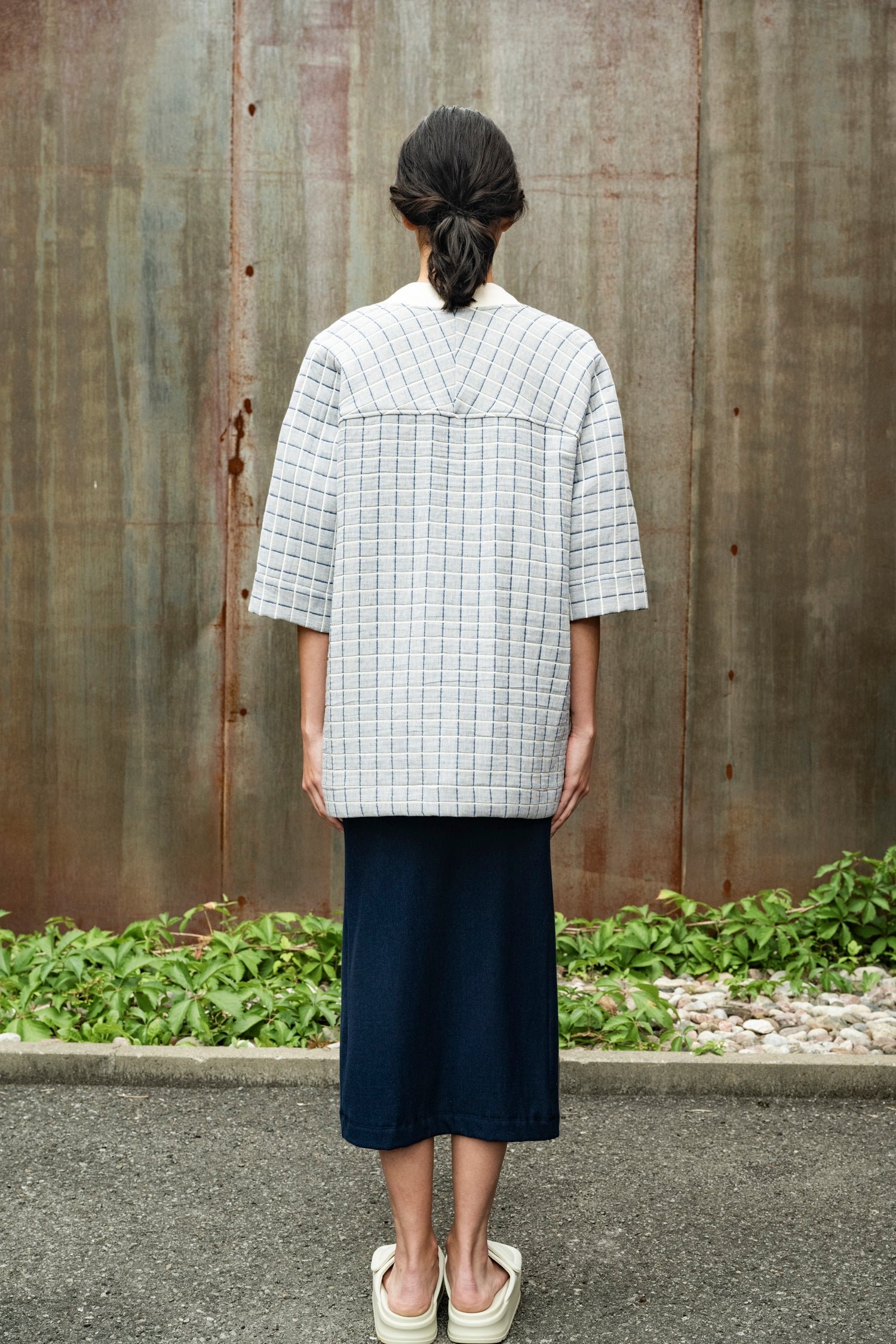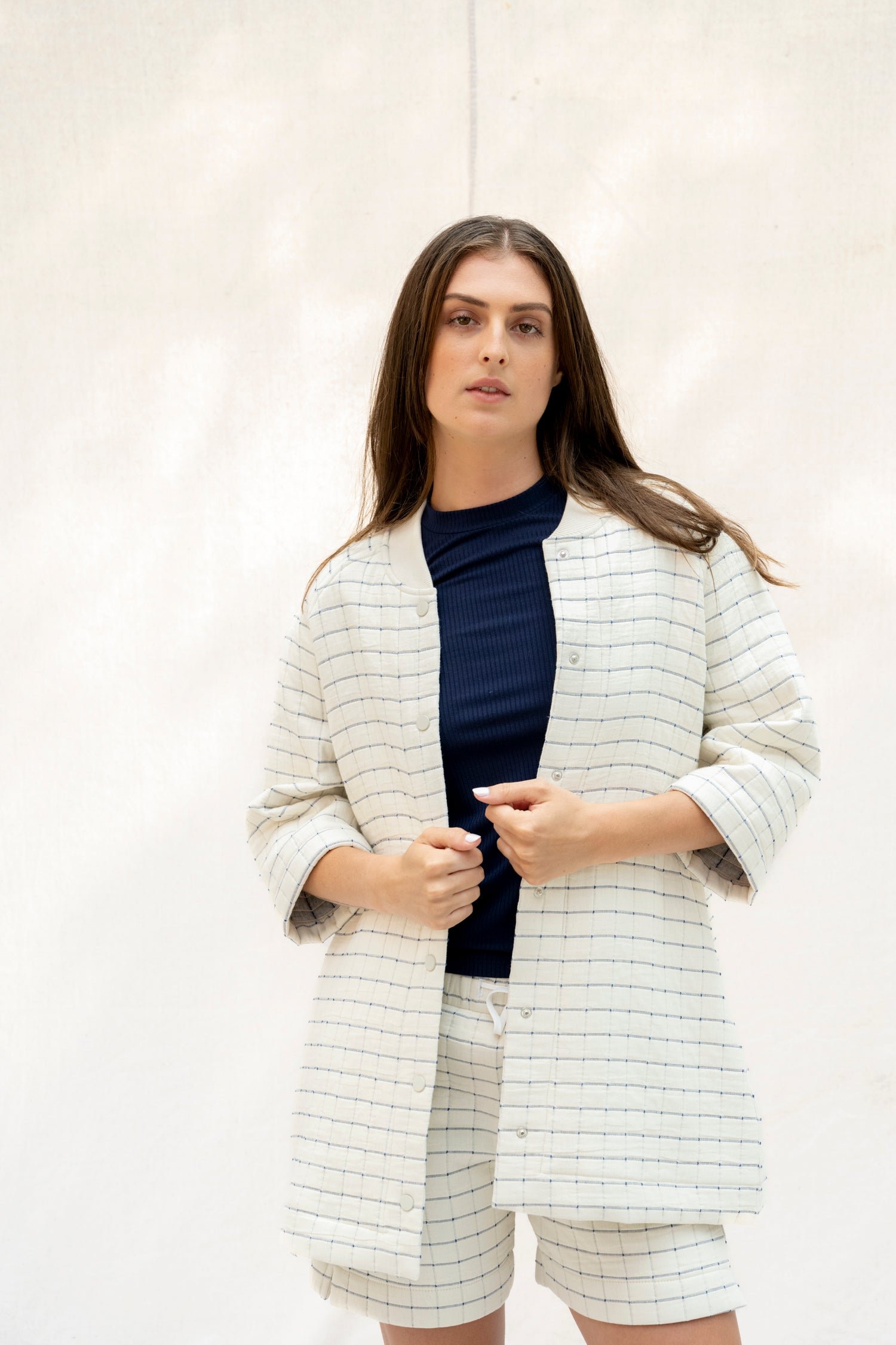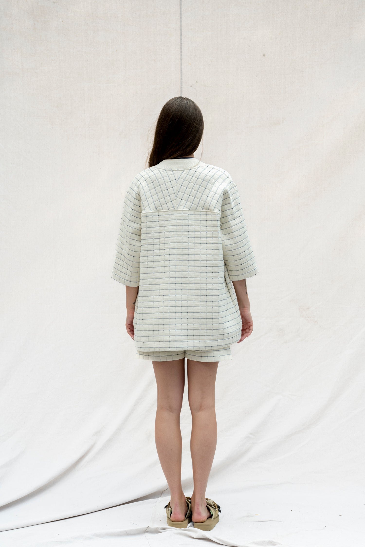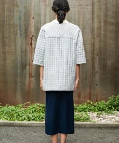 Jacket with snap buttons, a ribbed white collar, and a mid-arm length. The pattern of tiles creates a bold V shape across the shoulders, accentuated by the wide sleeves.