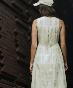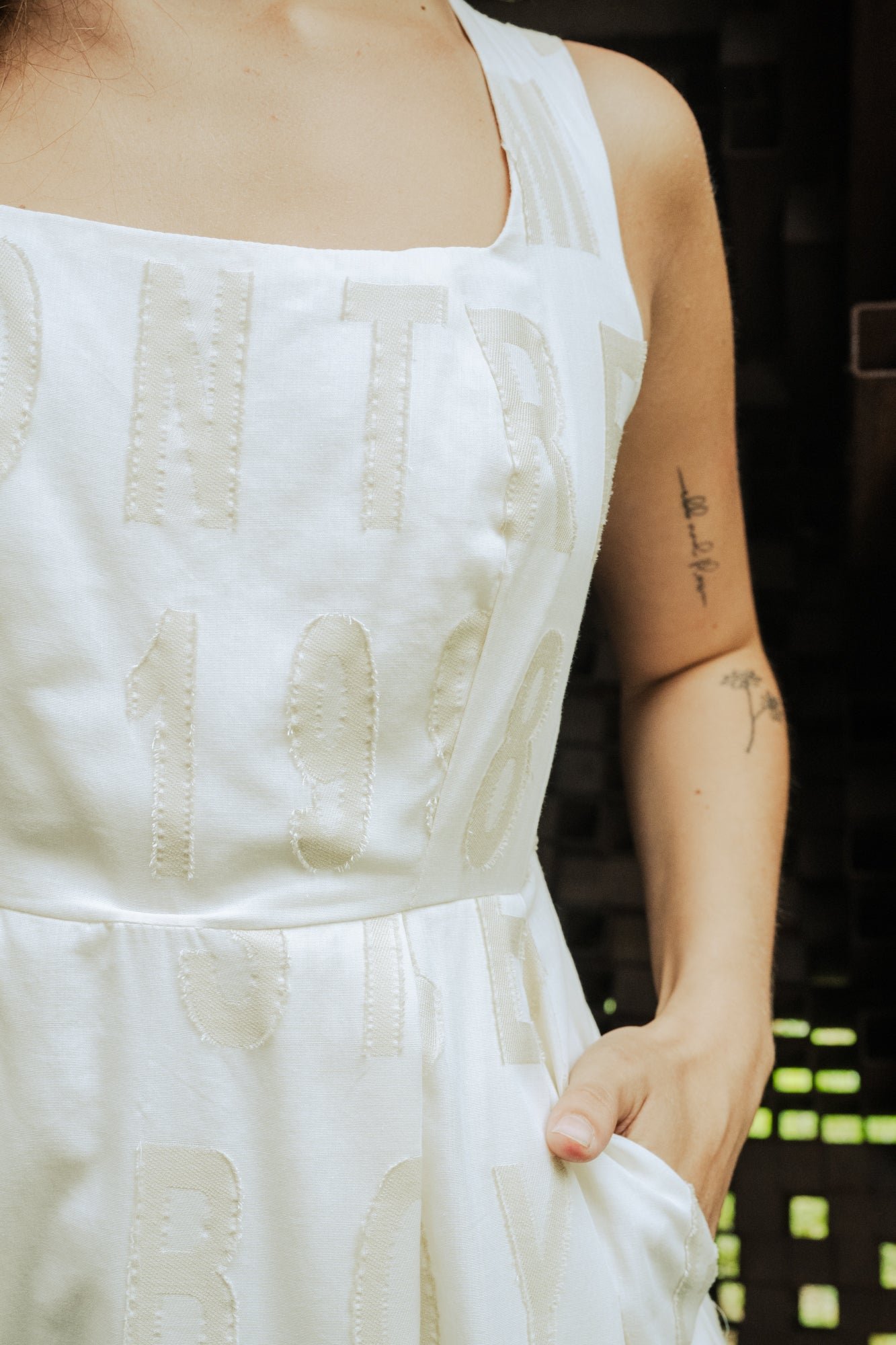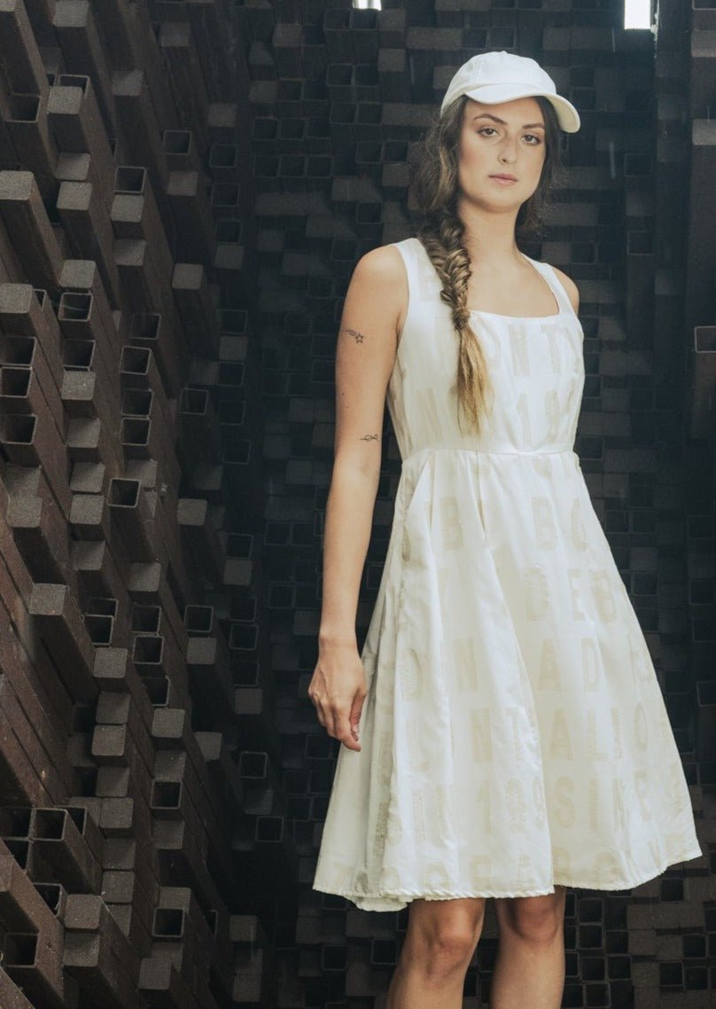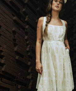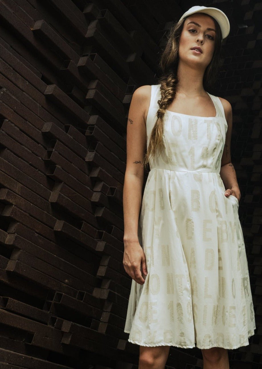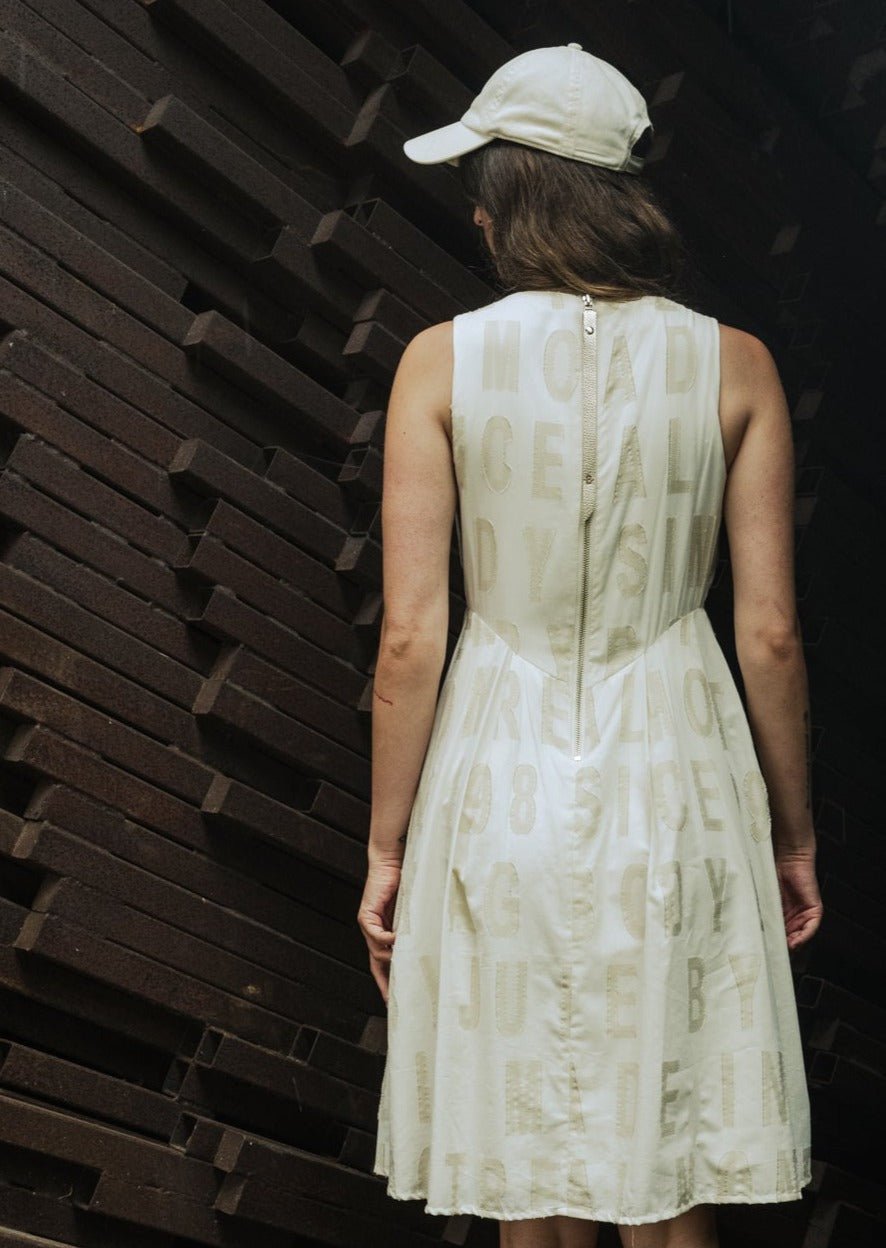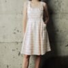 Luana fitted dress with pockets. Sleeveless tight fitted top and pleated skirt. Metal zipper with leather tab at the back. Pockets on the sides. Below the knee length.