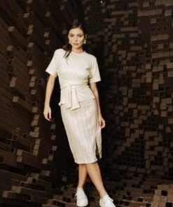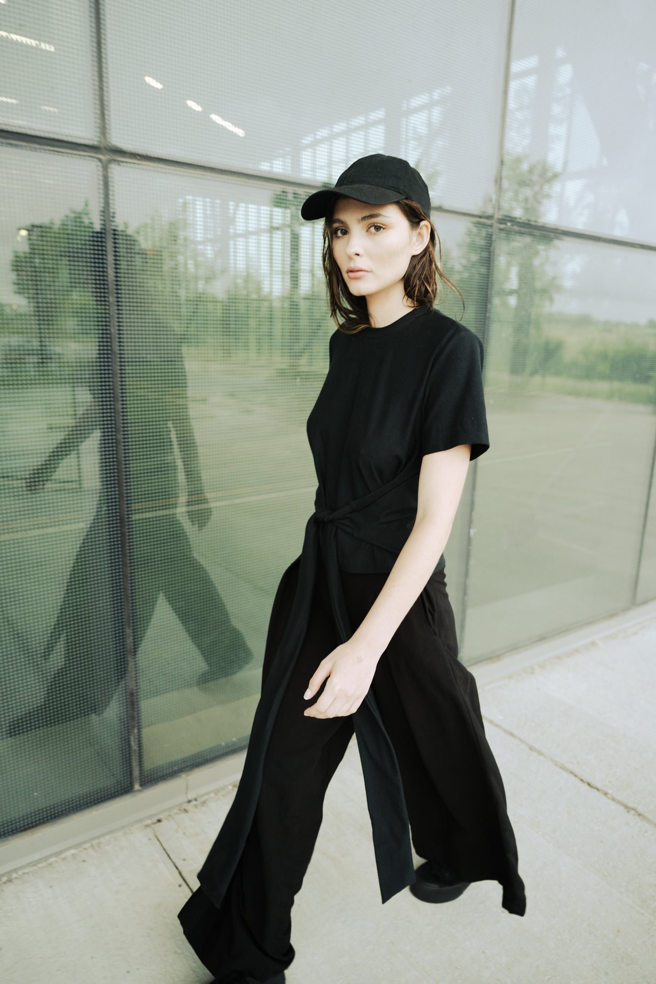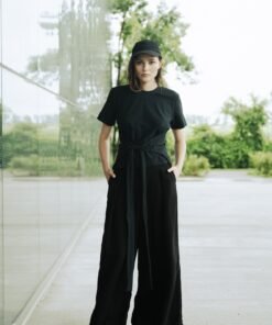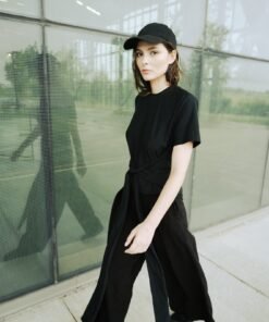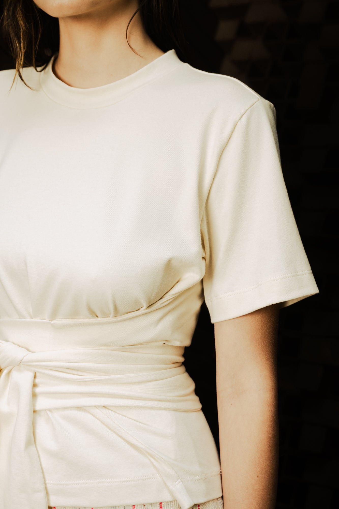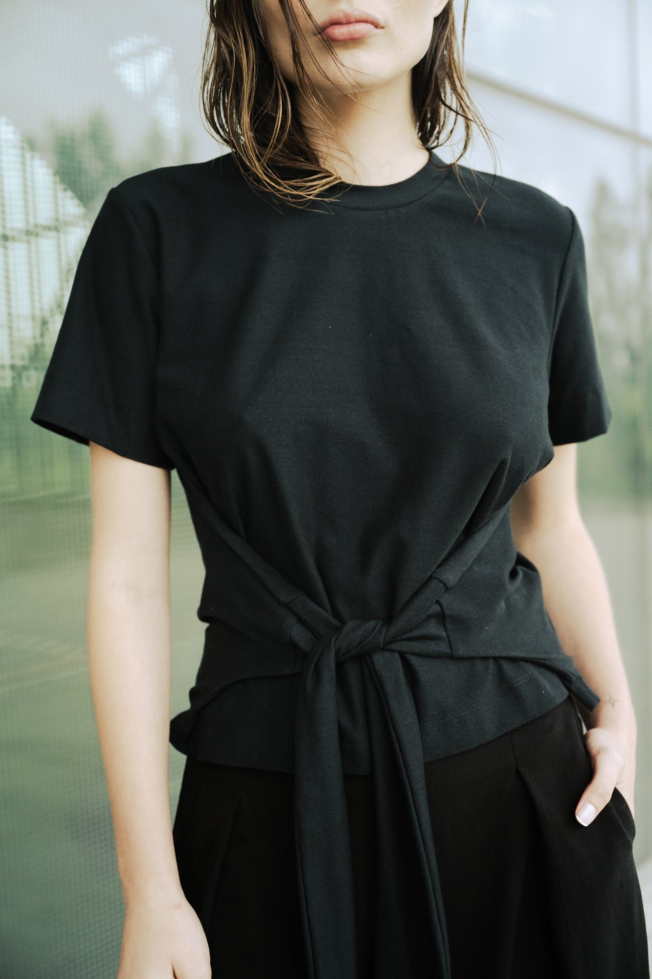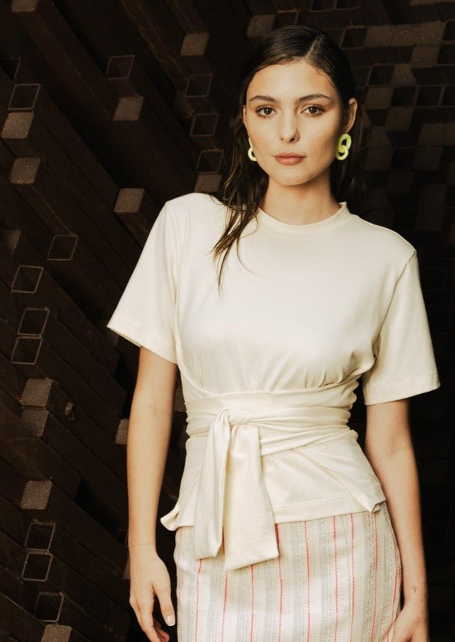 Jersey crossed T-shirt at the waist. Top that you can wrap around in 3 ways. Round neck and at short sleeves.