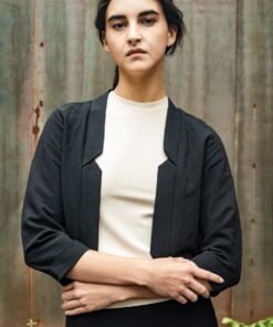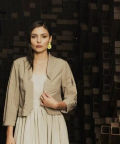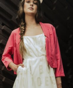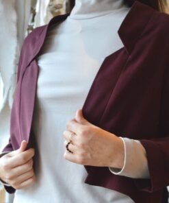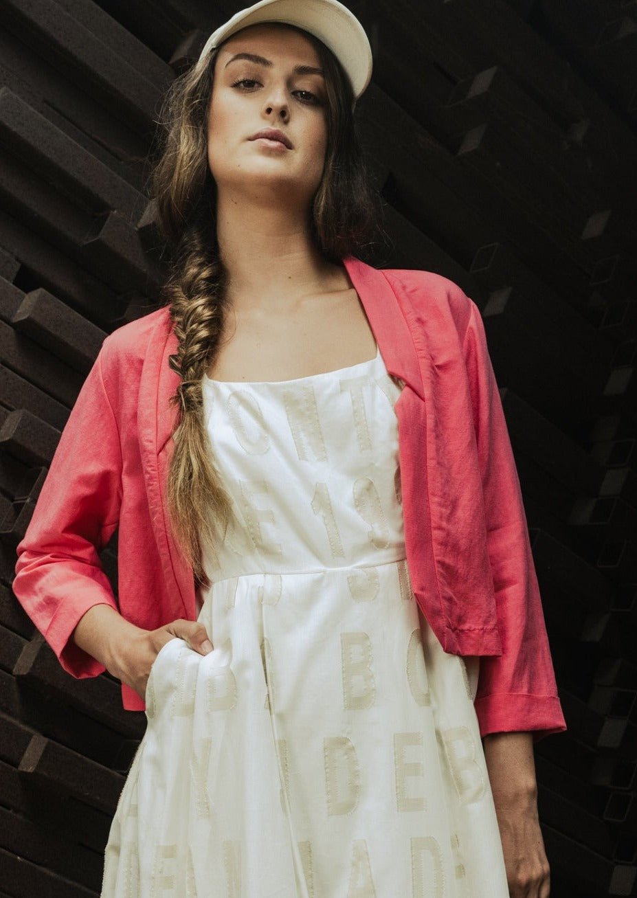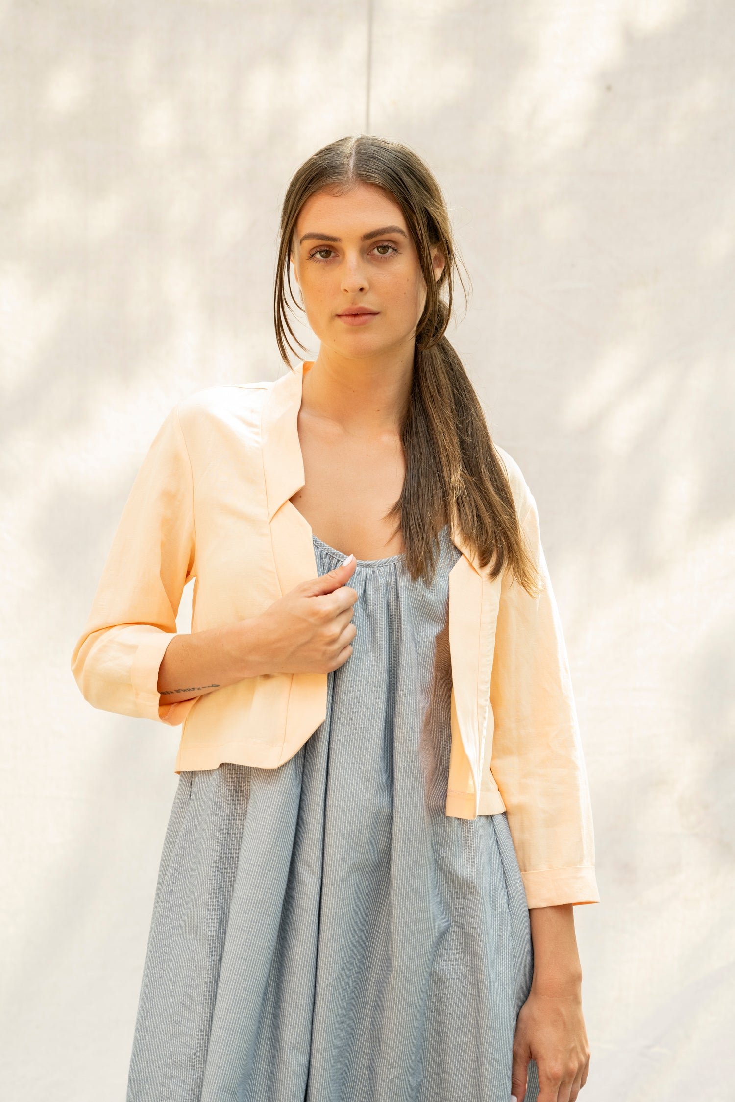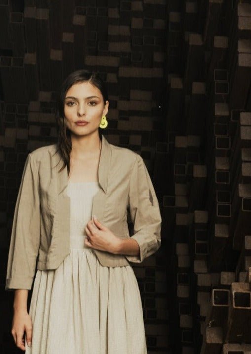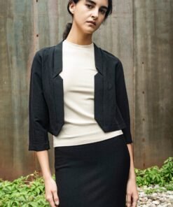 This short jacket features 3/4 sleeves and a decontracted fit, with a pleat in the back. The front is dropped open and it has a notch collar.