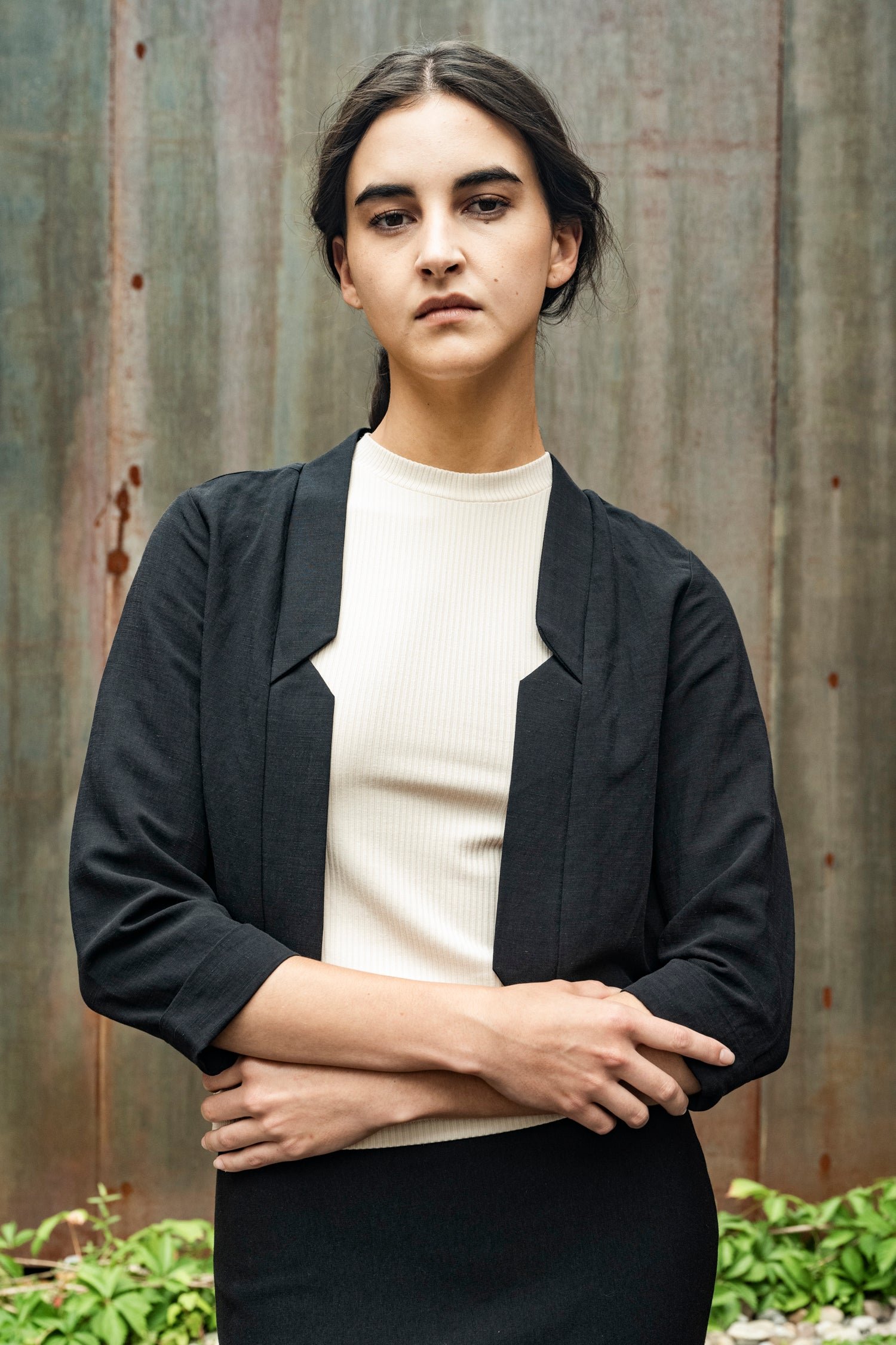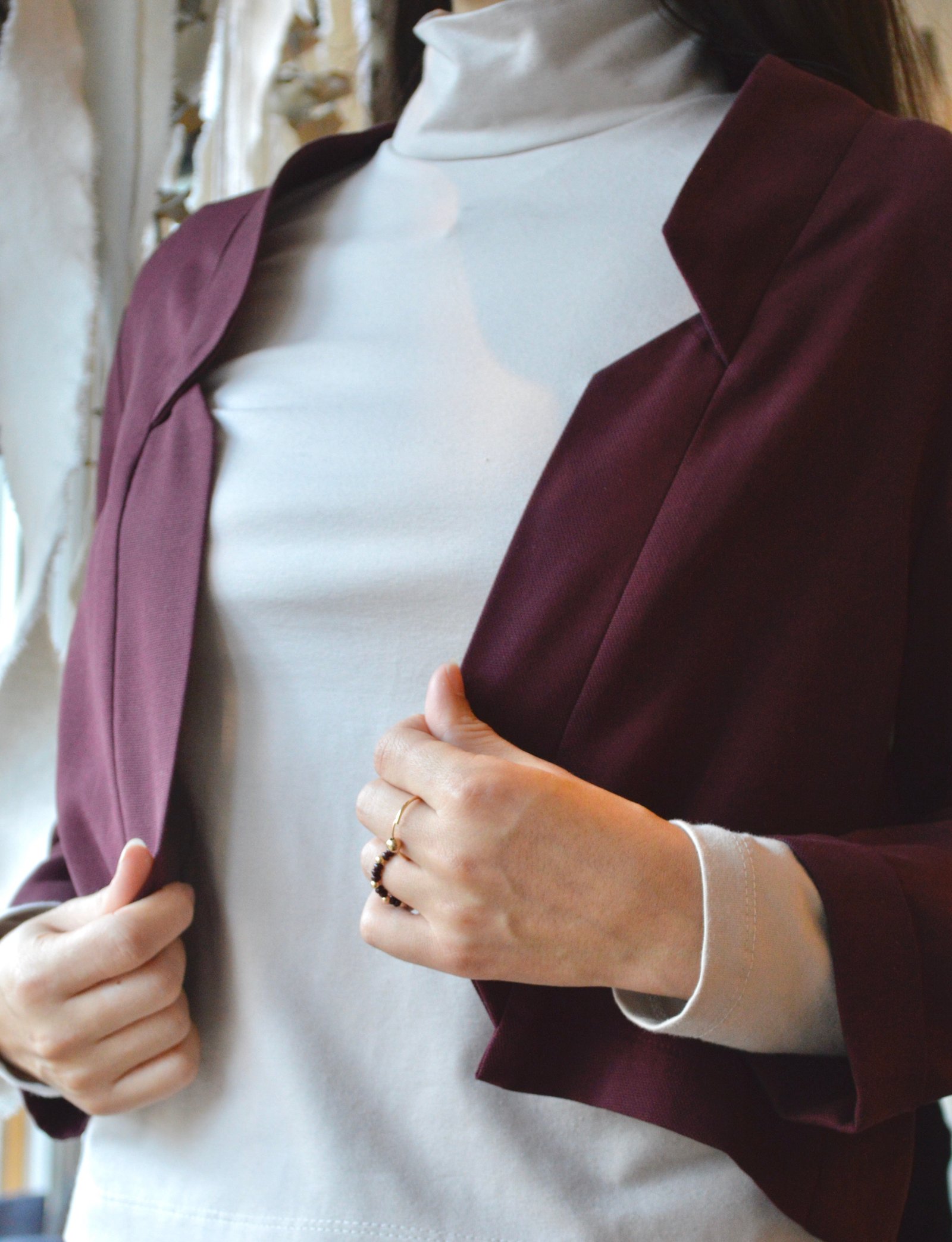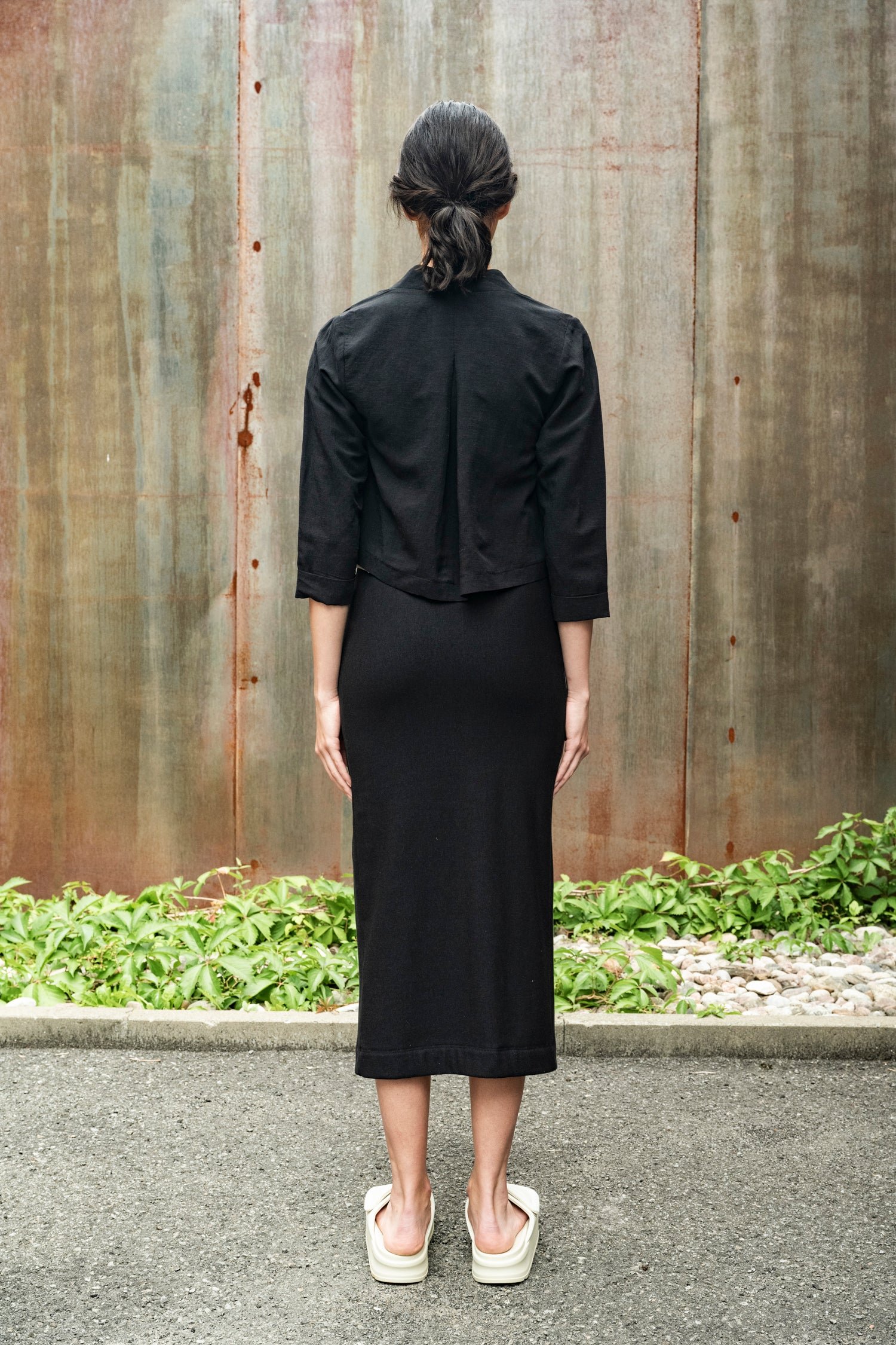 This short jacket features 3/4 sleeves and a decontracted fit, with a pleat in the back. The front is dropped open and it has a notch collar.