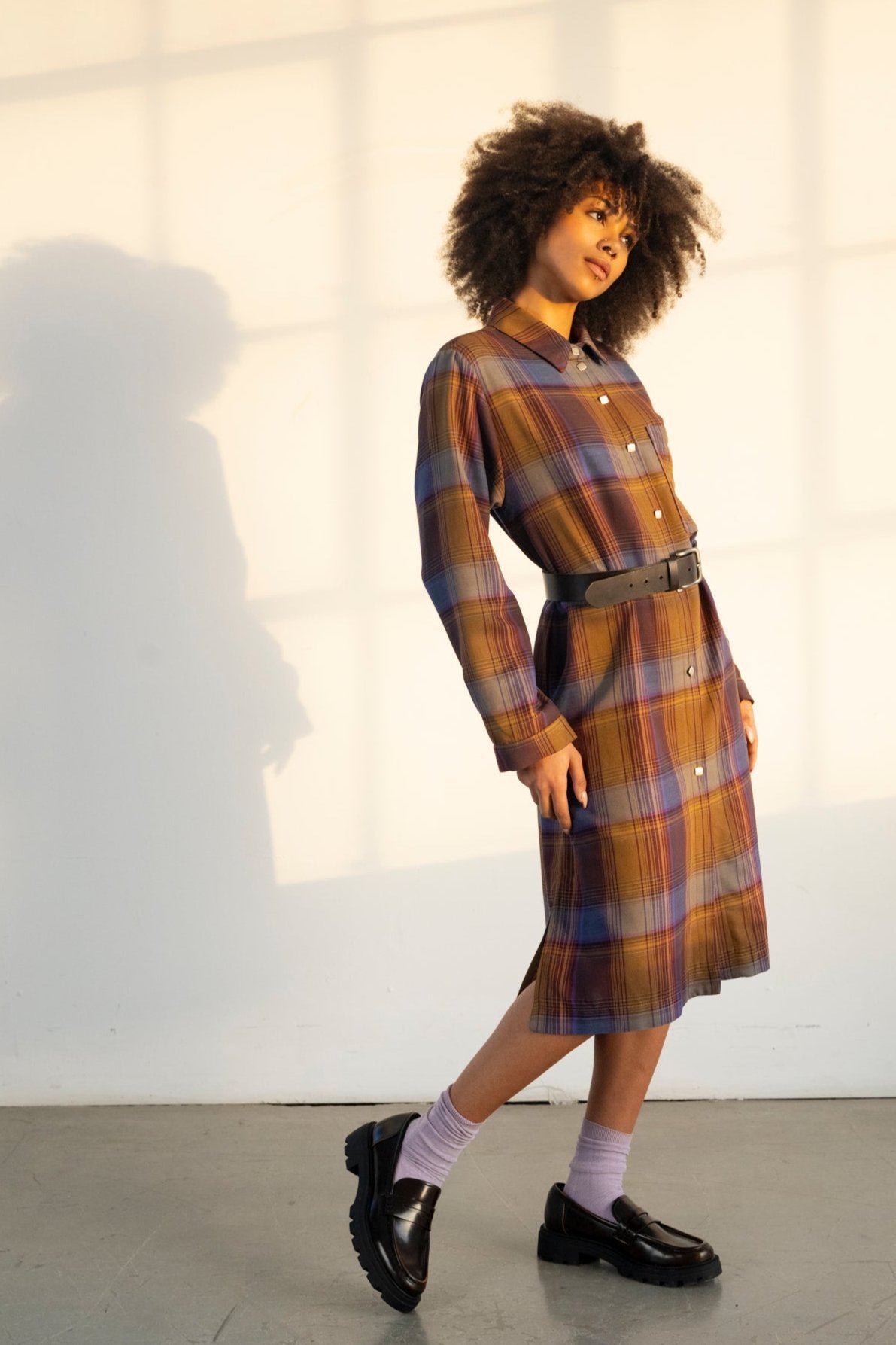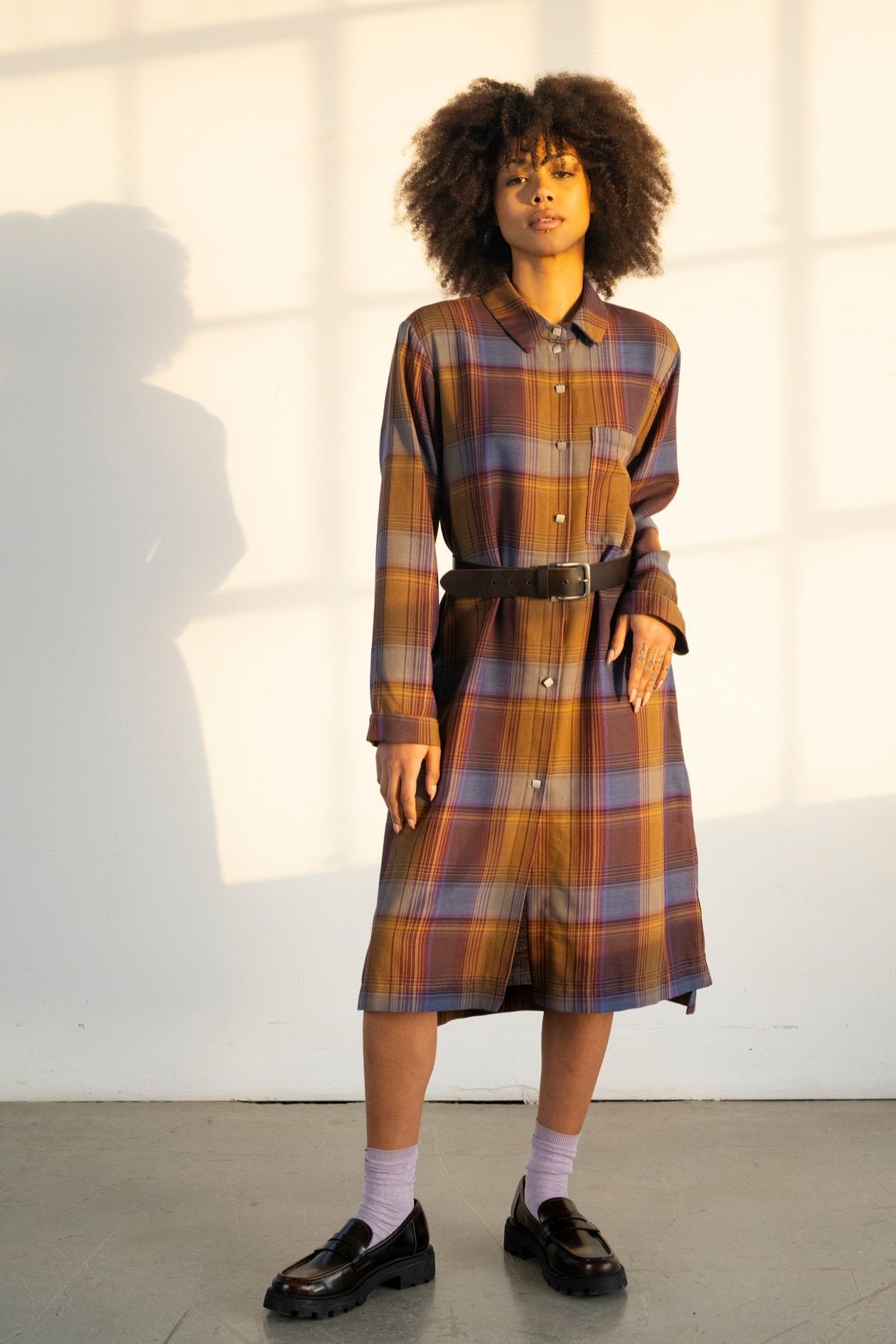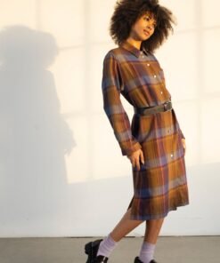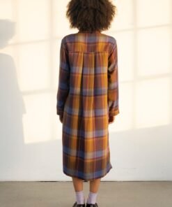 Button down loose shirt dress with long sleeves. One front pocket applied. Pleated at the back, slit on side and high low hemline.
