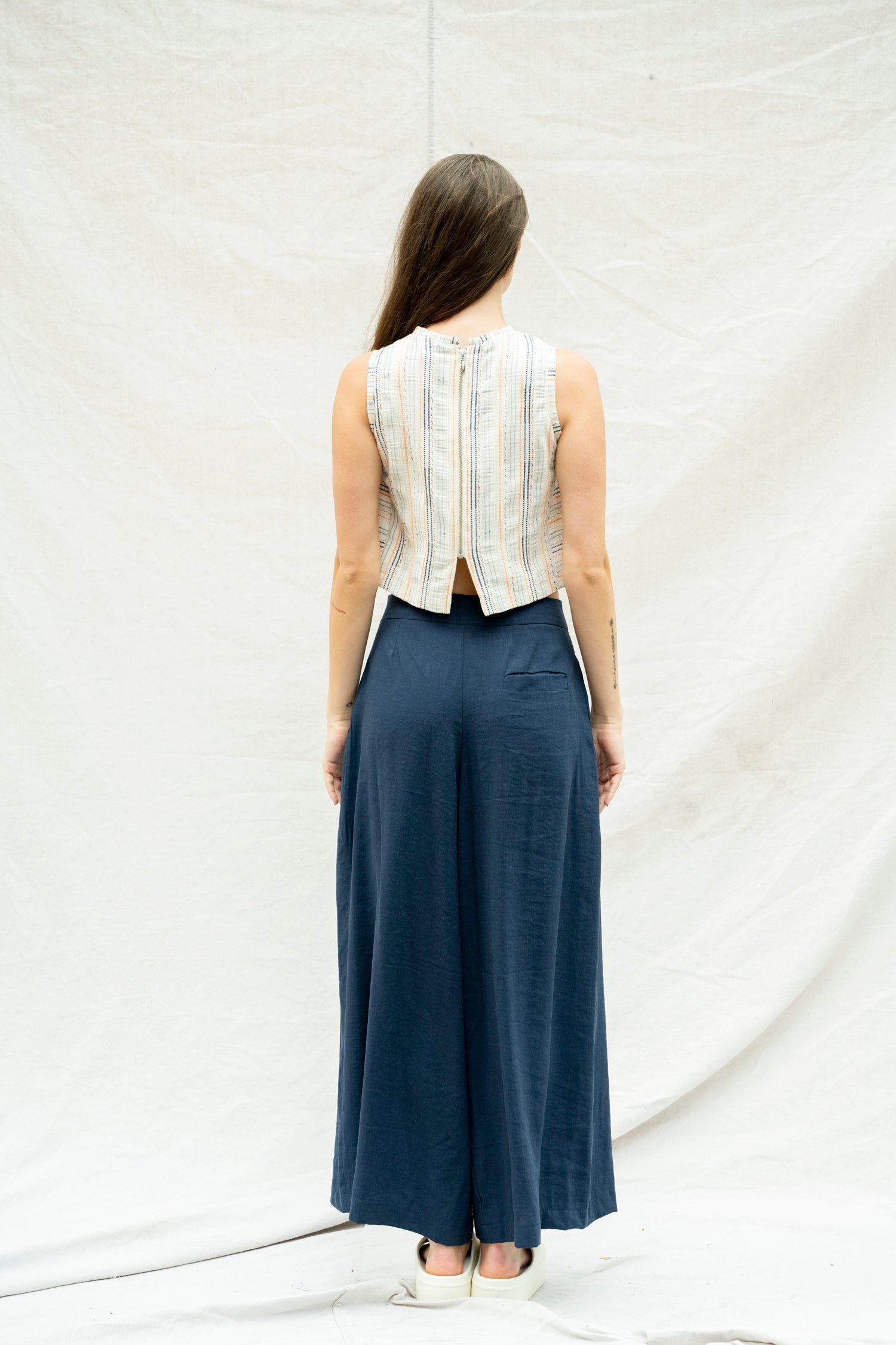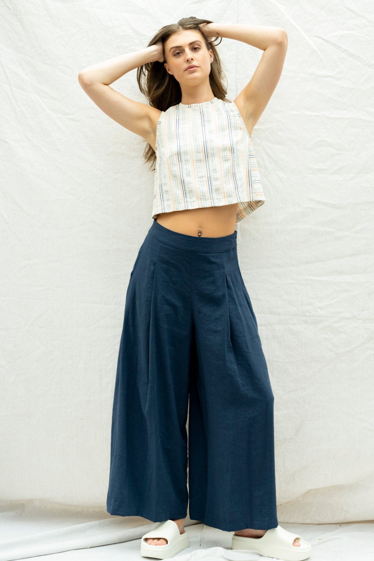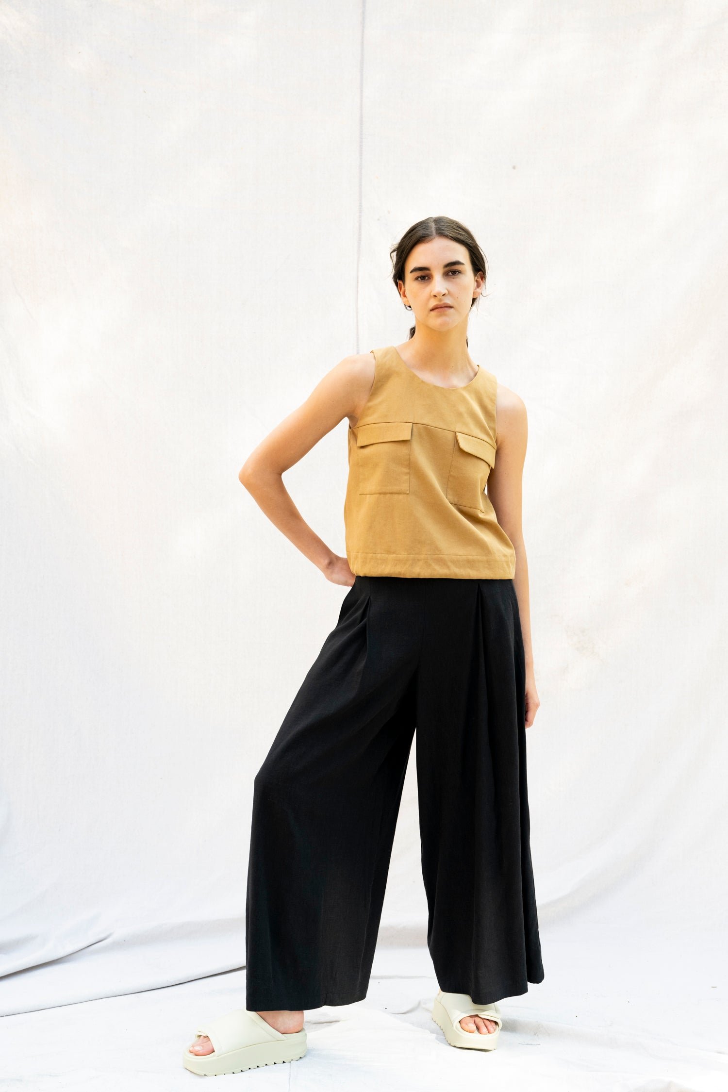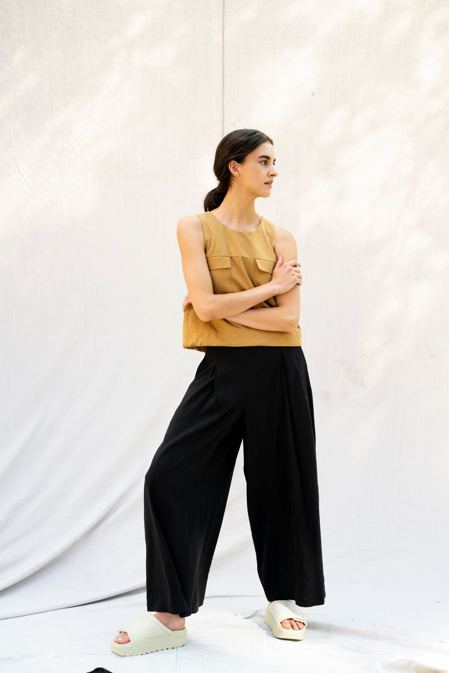 These pants have a high waisted fit with side pockets and an invisible zipper on the side. The inside leg length (inseam) measures 29 inches and pleats at the front provide a polished and elegant drape.