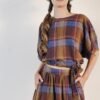 Boxy top with short cuffed sleeves . Asymetrical rounded hem.