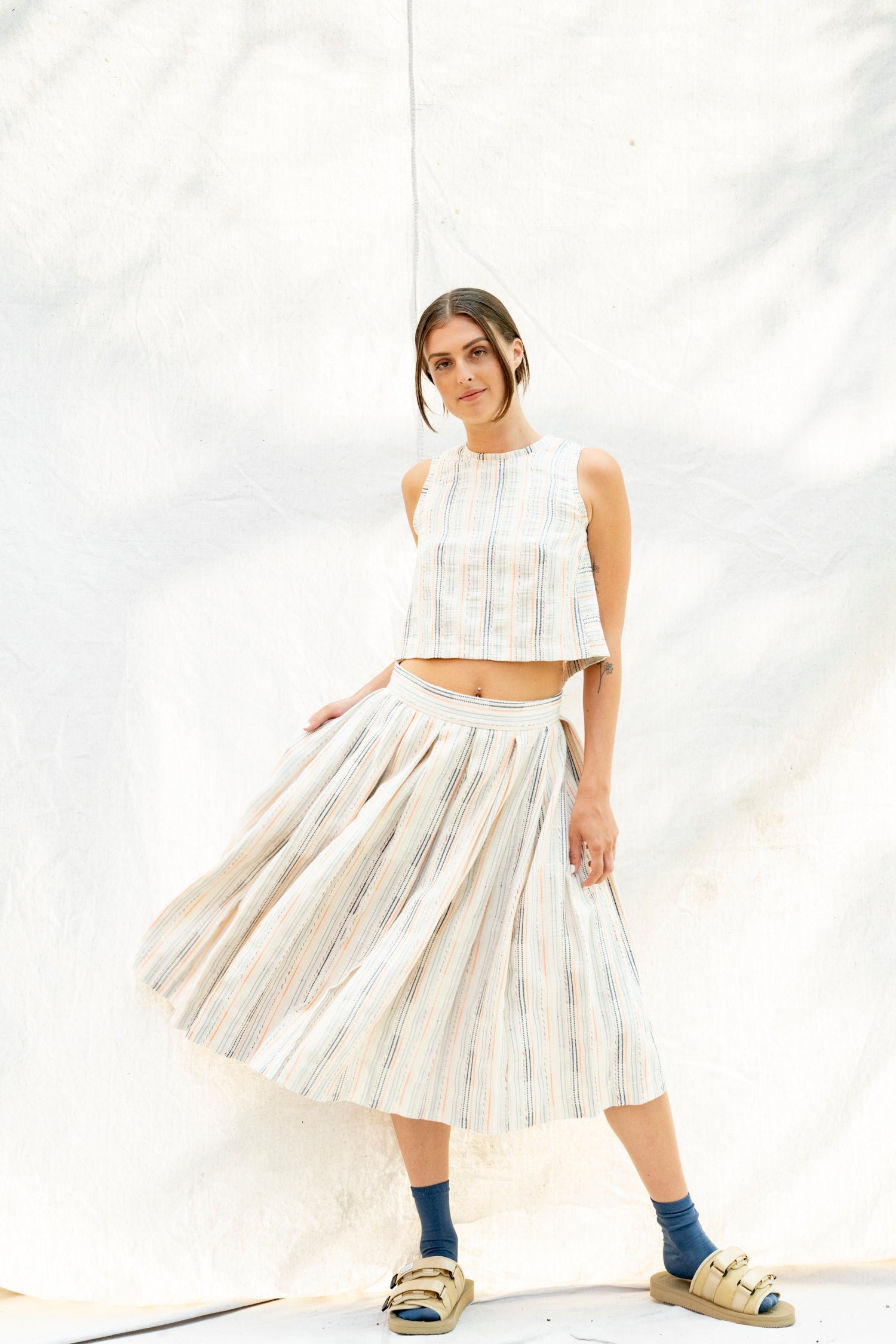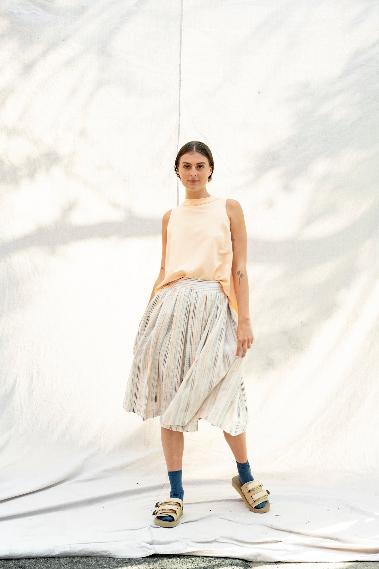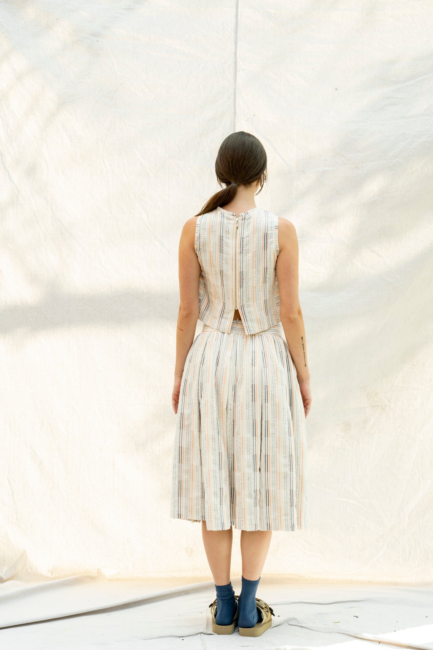 Below-the-knee skirt with a discreet invisible zipper at the back.